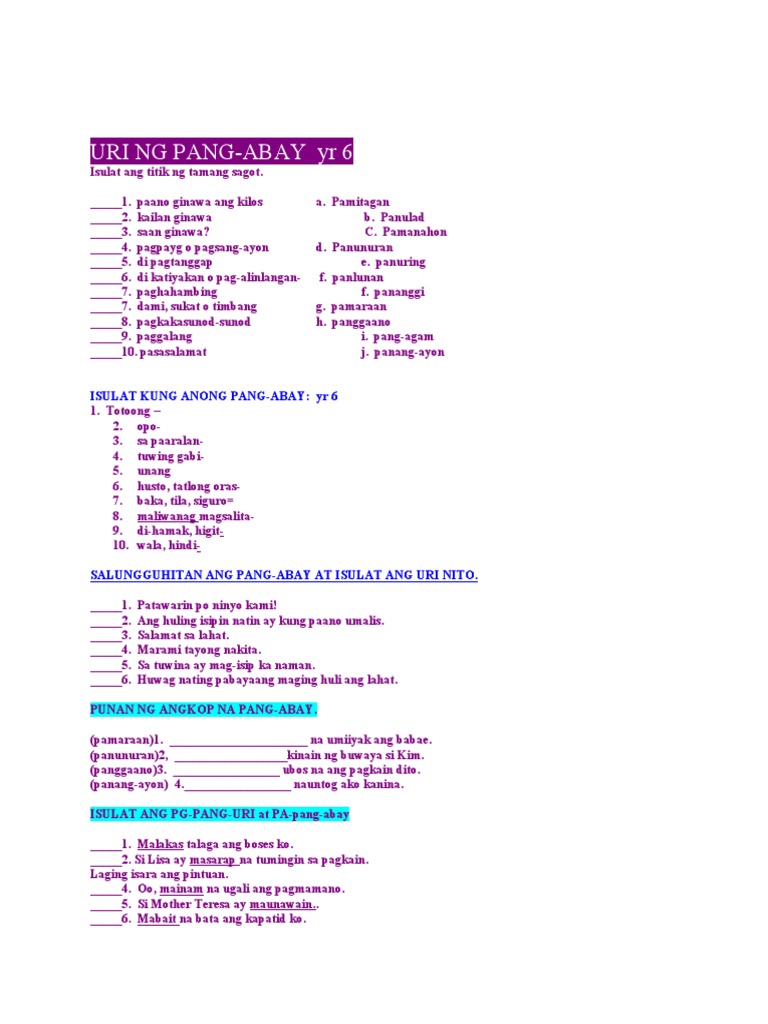 Displaying 8 worksheets for pang abay at pang uri.
